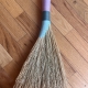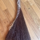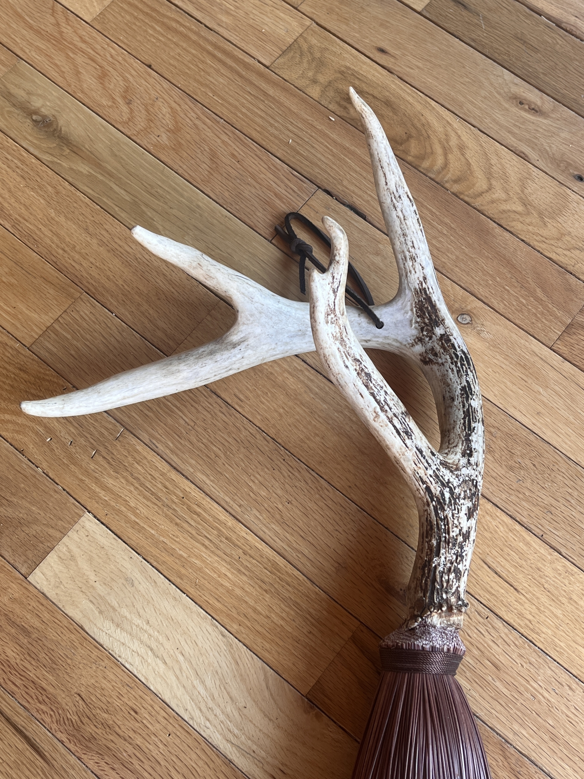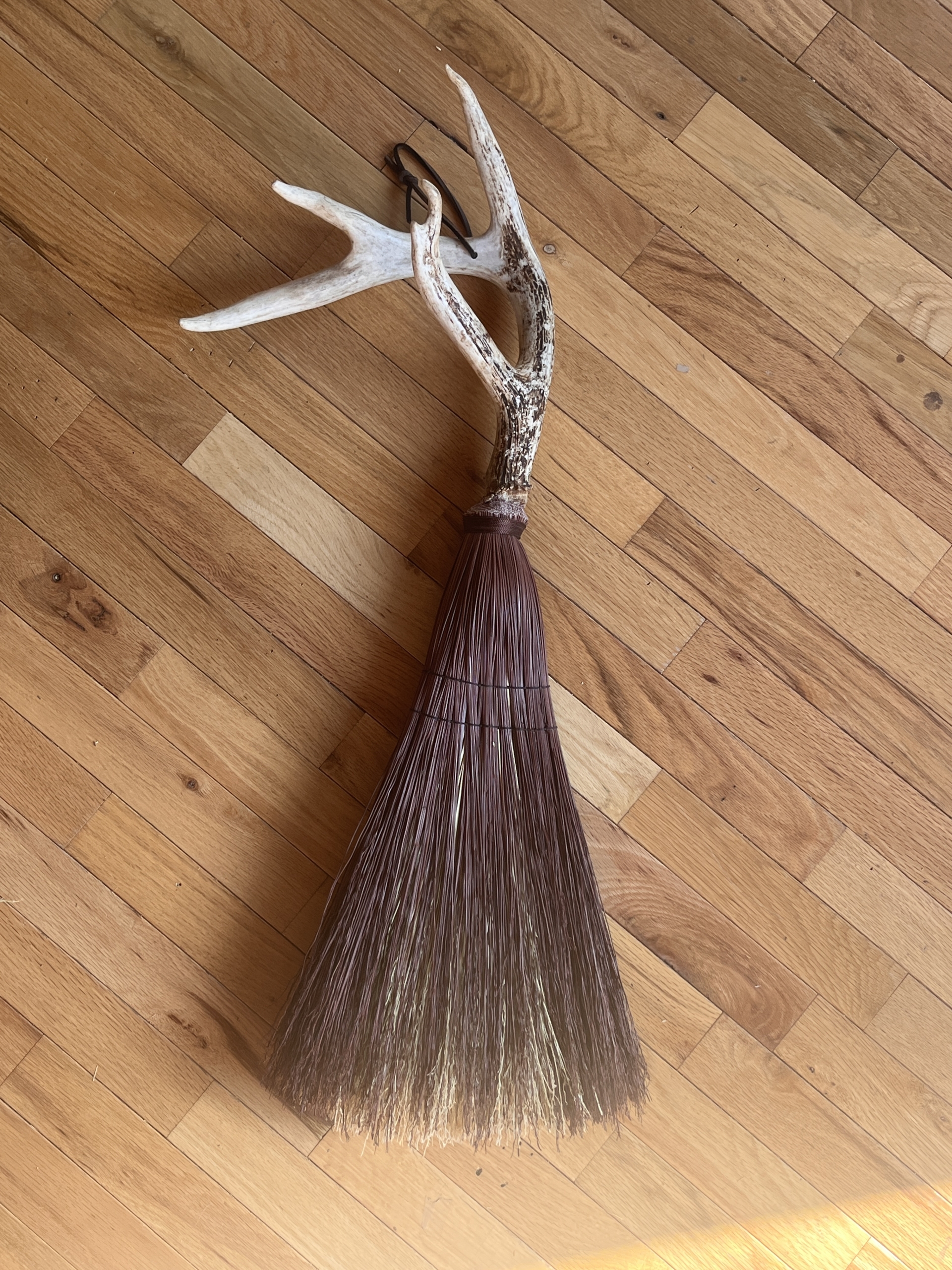 A unique hearth broom made with a deer antler shed made with hand died broom corn and nylon string.