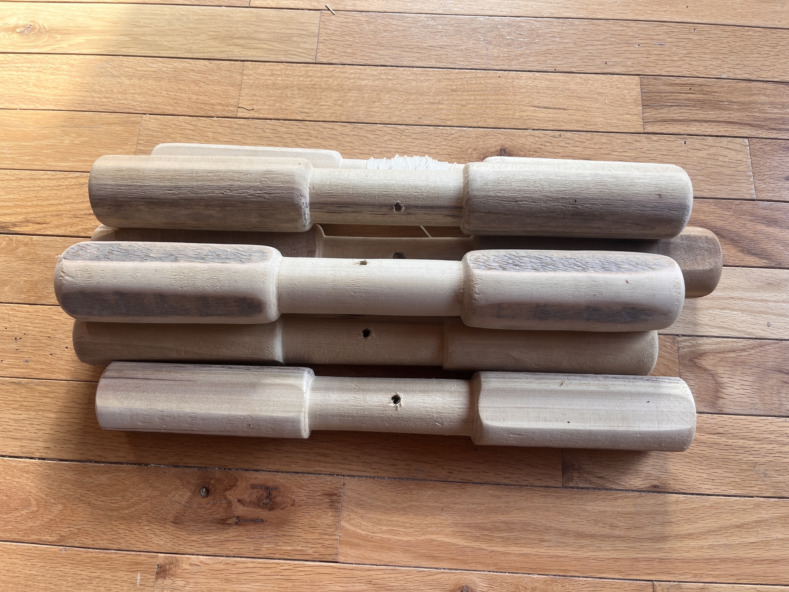 These discounted treadles have previously been used for classes. They are more rounded than square, so require a different level of awareness to work with (though some broom-makers use fully round dowels!)