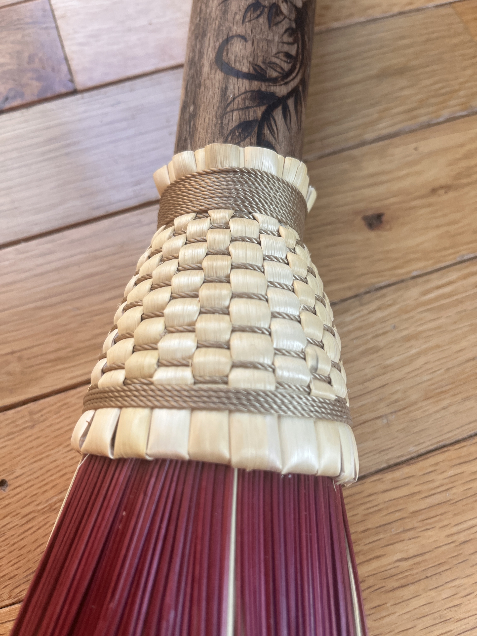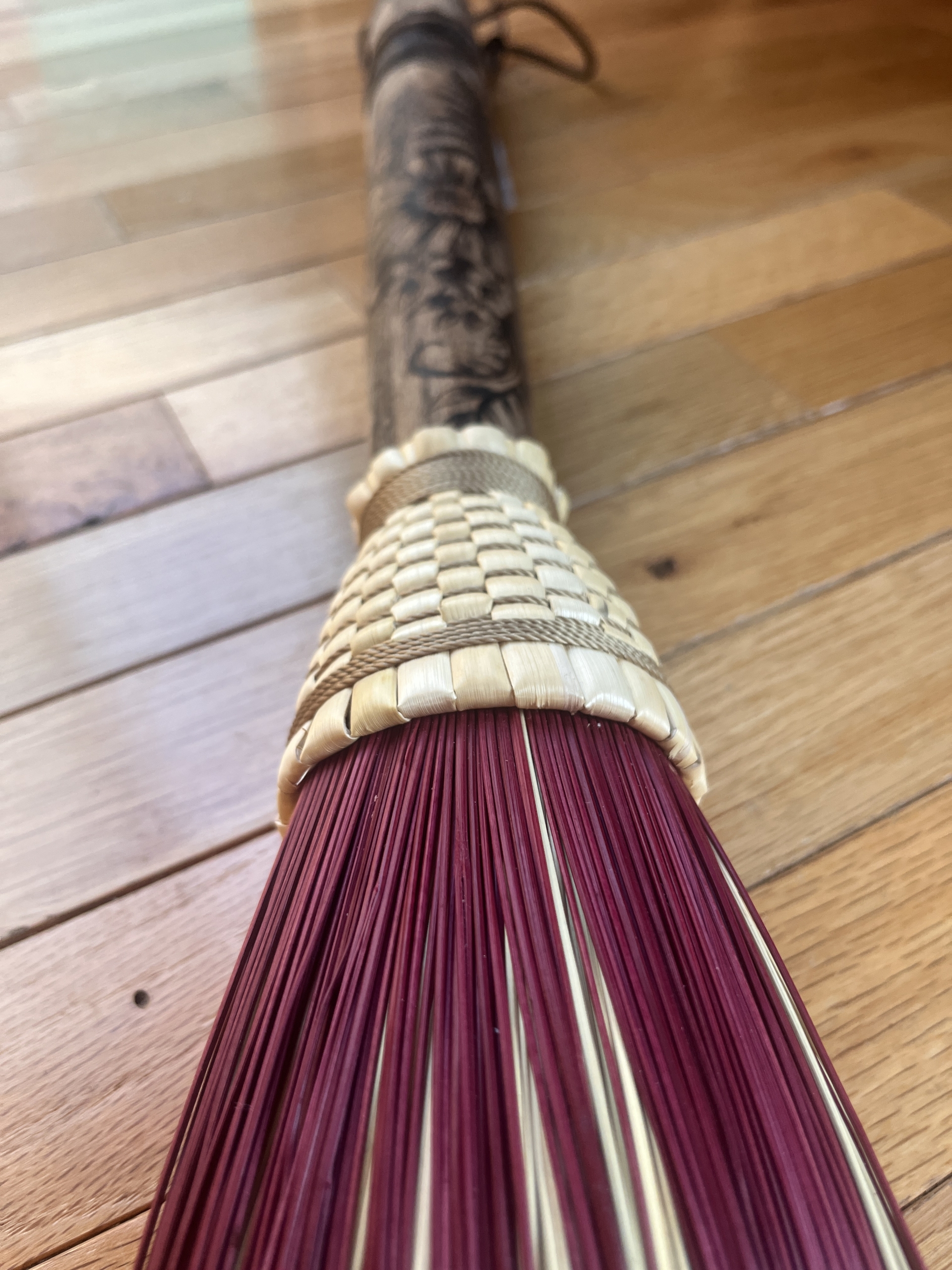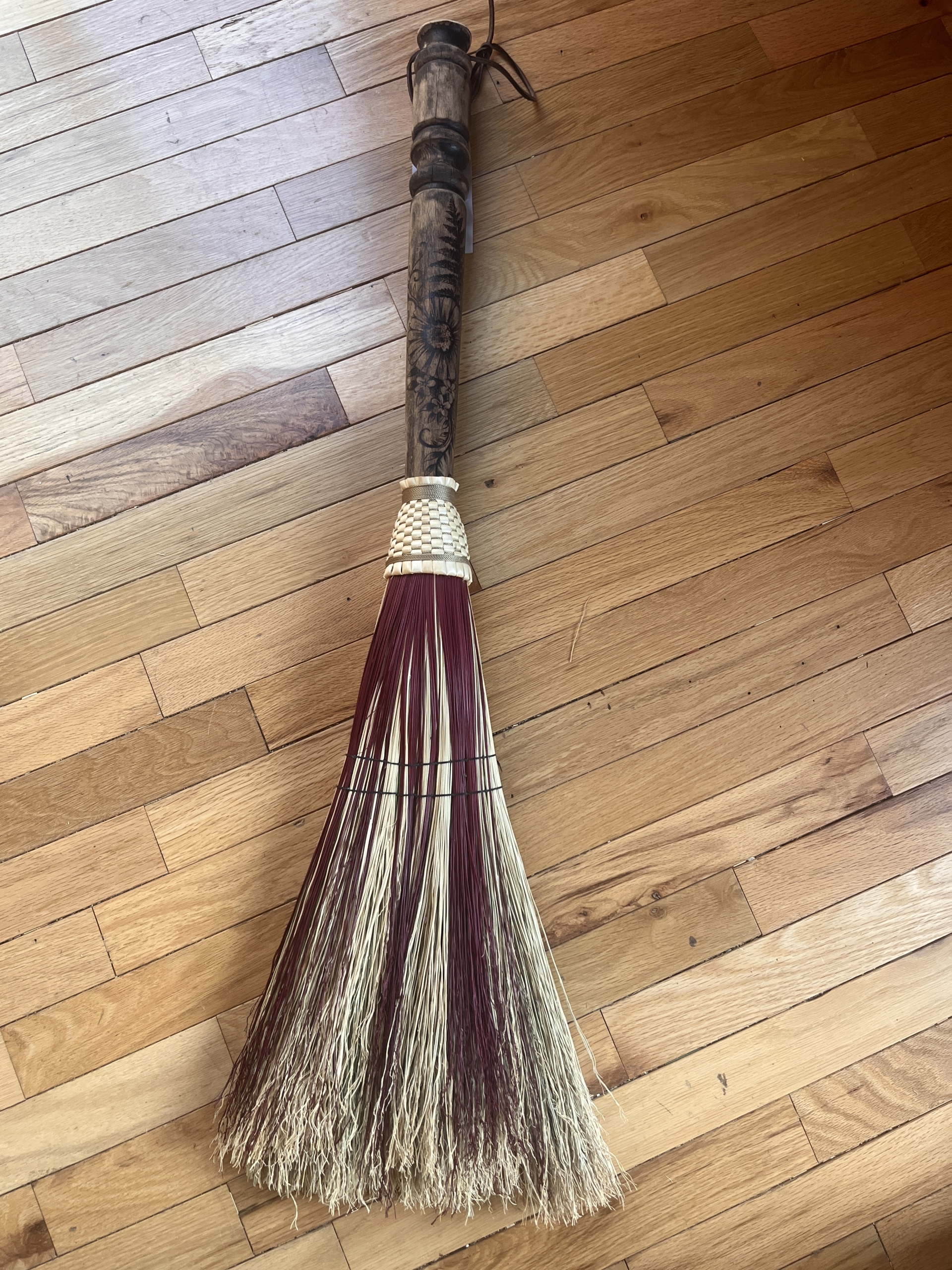 Bound with natural broomcorn and broomcorn stalks, this broom is both sturdy and soulful—equally at home as a working hearth broom or as a striking art piece. Perfect for farmhouse interiors, cozy cabins, or beside a fireplace or woodstove, it brings warmth, intention, and timeless character into any space. No two are alike, making this broom a truly special heirloom piece.
