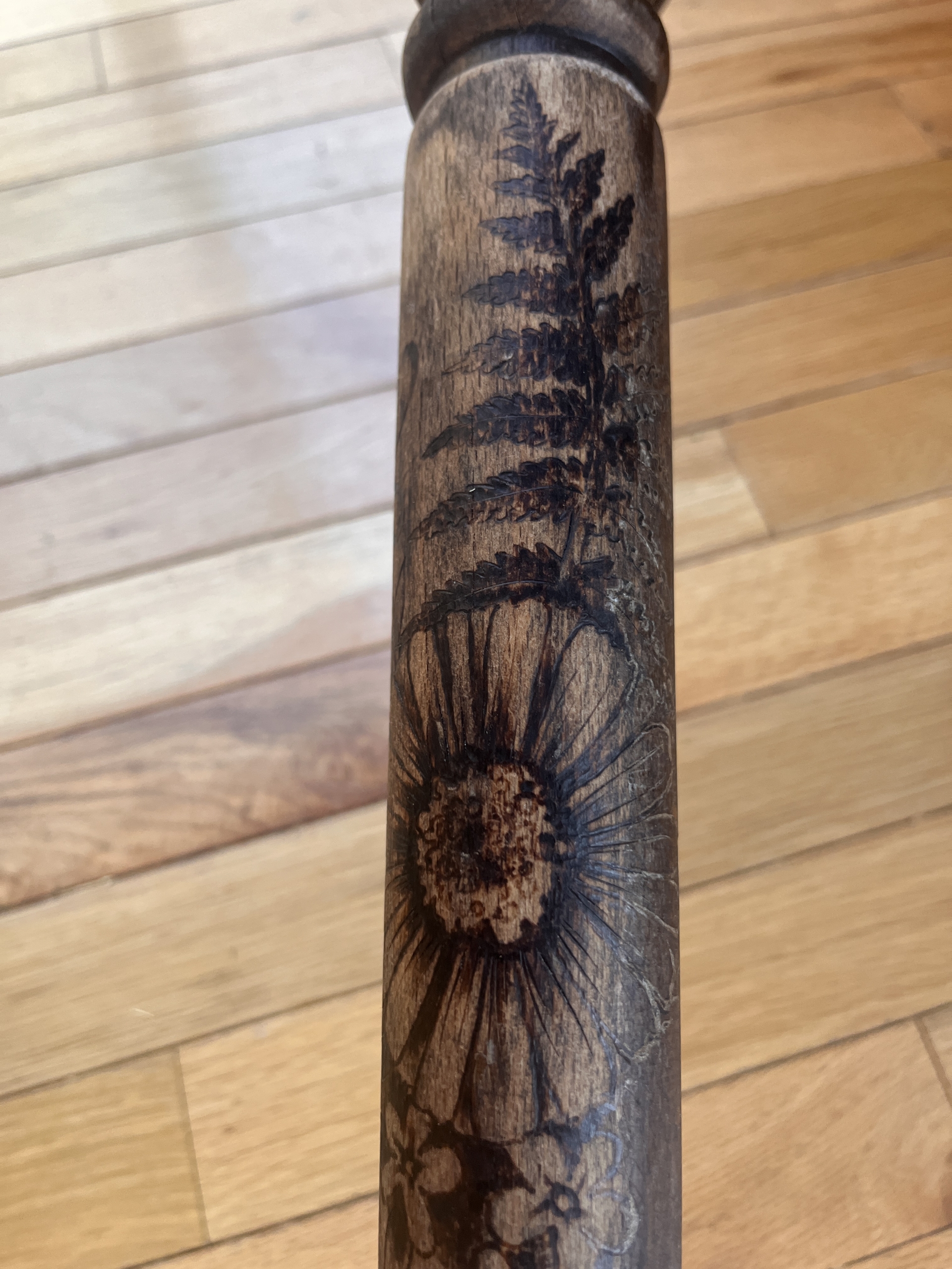 A one-of-a-kind hearth broom that blends beauty, function, and story. The Floral Fern Hearth Broom features a repurposed wooden table leg, thoughtfully transformed and hand wood-burned by artist Bee Beddingfield with delicate floral and fern designs. Each etched detail honors the natural world and the quiet artistry of traditional handcraft.