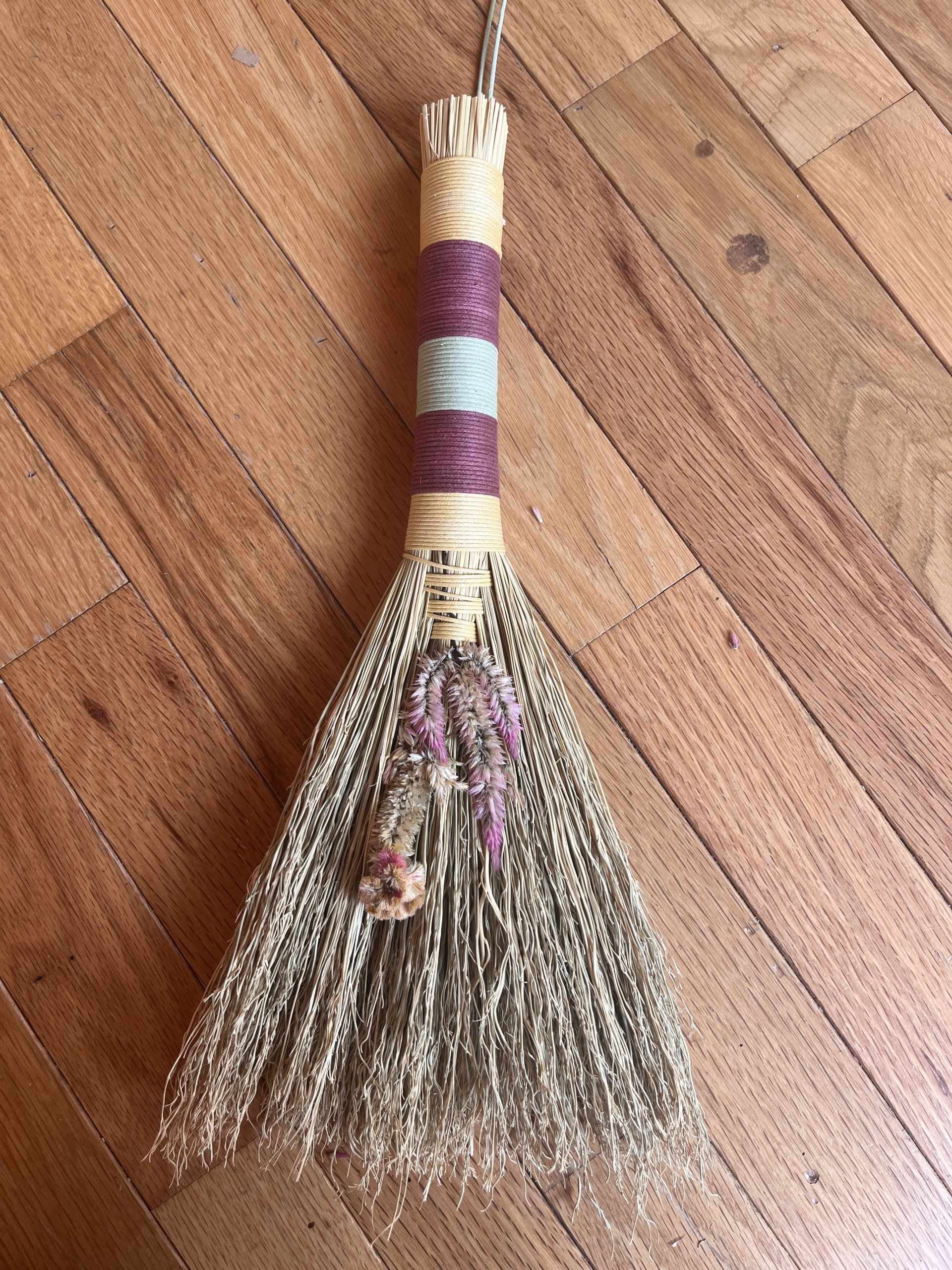 This little broom is bound with organic cotton string and made with natural broomcorn and homegrown celosia flowers.